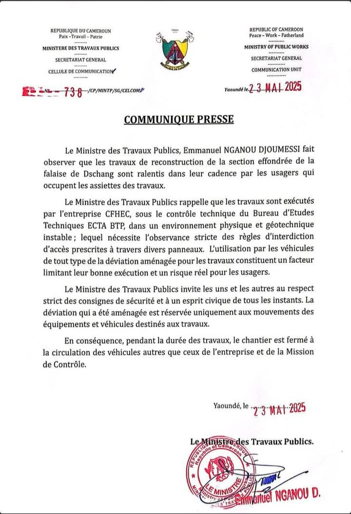 Le 15 mars 2025, le gouvernement camerounais, par le biais du Ministère des Travaux Publics, lançait les travaux de réaménagement (ce qui est différent de reconstruction) de la falaise effondrée de Dschang.