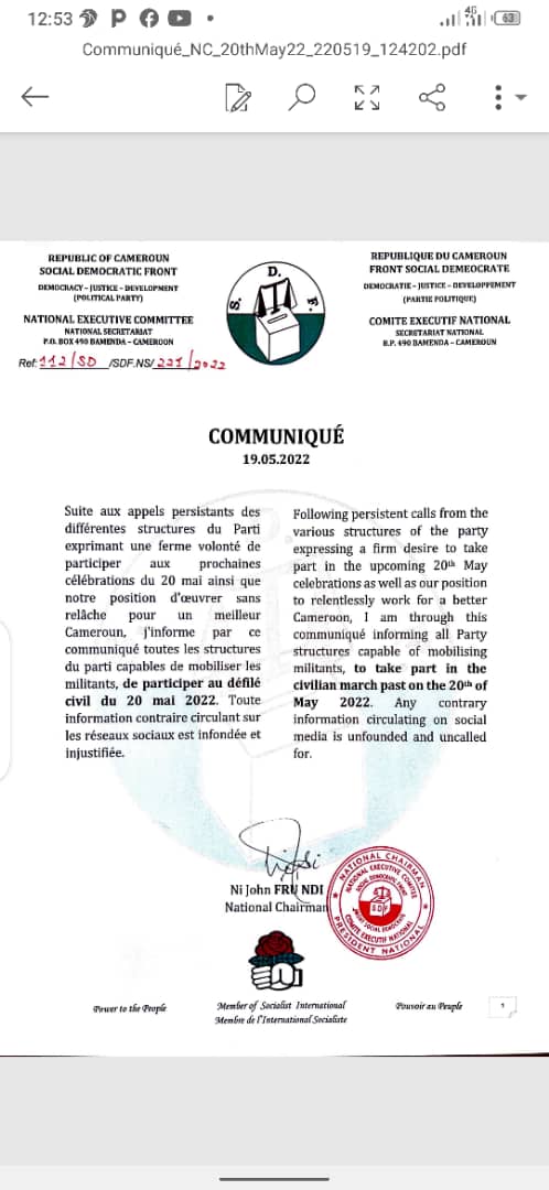 Le débat est donc clos ; l' annonce de la participation au défilé du Social Democratic Front-SDF a été faite ce jour par un communiqué signé de la plus haute instance du parti, Ni Njon NFRU NDI.