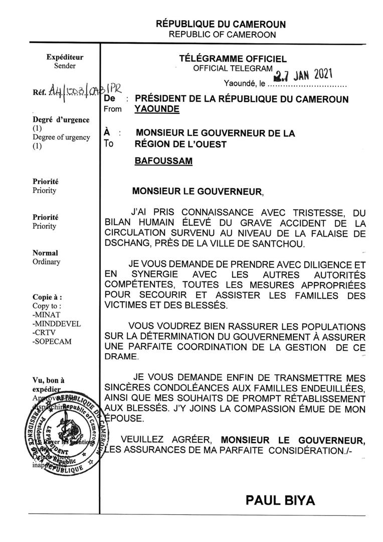 Dans un télégramme signé ce mercredi 27 janvier 2021, le président de la République adresse ses condoléances aux familles des victimes et blessés de cet accident survenu à la falaise reliant Santchou à la capitale départementale Dschang.