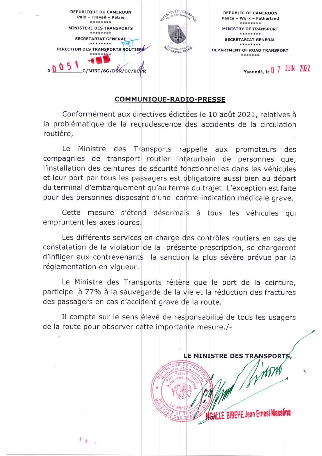 Ce 07 06 2022, le ministre des transports a rappelé aux promoteurs des compagnies de transport inter-urbains l'obligeance de munir leurs véhicules de ceintures de sécurité, et de veiller à leur utilisation effective par les passagers durant les voyages