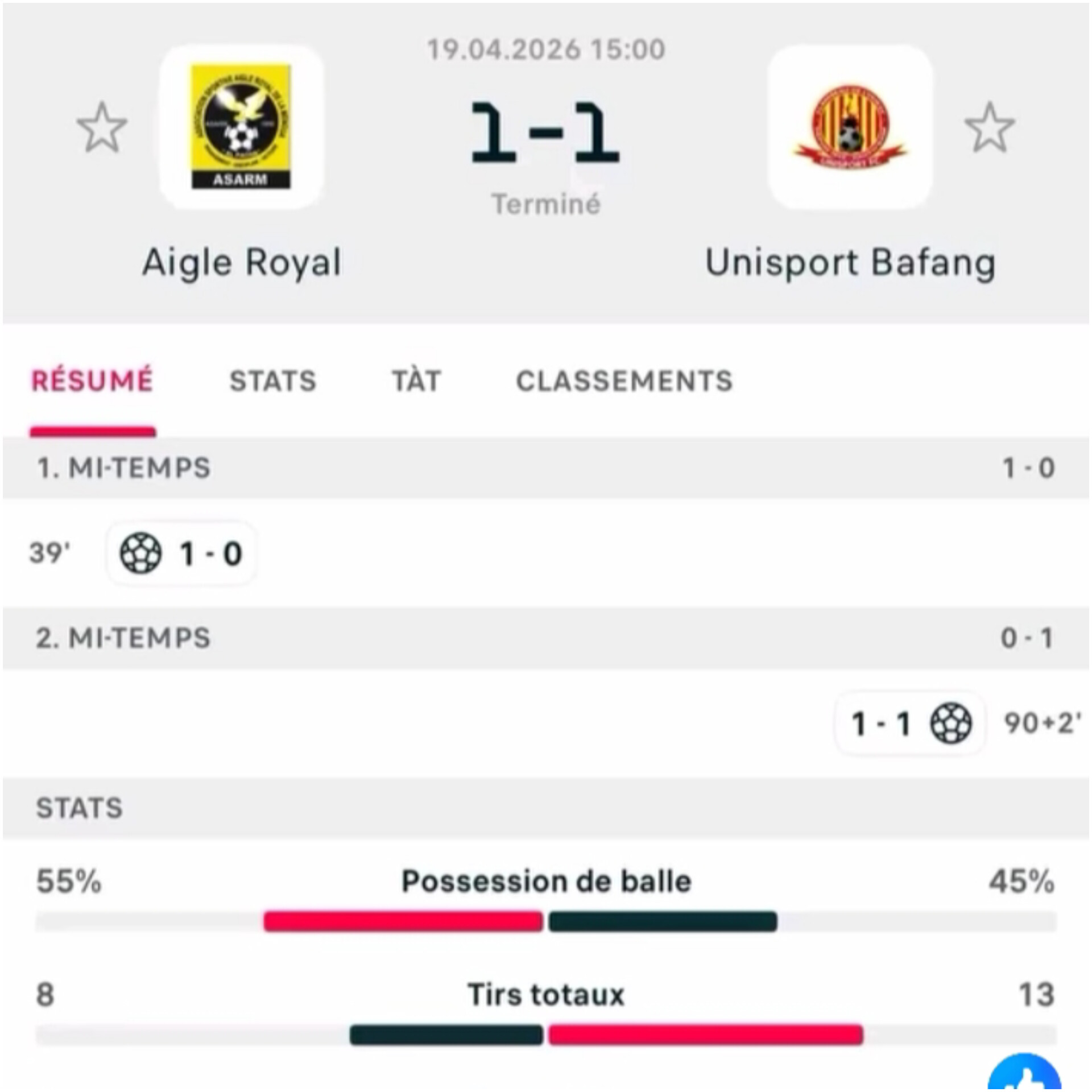 Aigle Royal de la Menoua, qui recevait Unisport du Haut-Nkam, leader de la phase aller, a livré un match de haut niveau, mais n'a pas réussi à décrocher la victoire, malgré une domination quasi-constante.