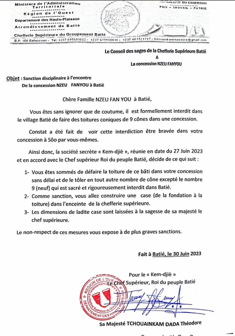 La famille Nzeu Fan est donc sommée de « _défaire la toiture de ce bâti_ » dans les plus brefs délais. Elle devra en outre construire une case au sein de la chefferie, selon les exigences de sa Majesté Tchouainkam Dada Théodore.