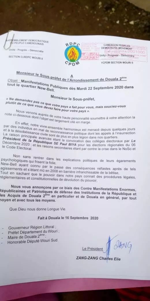 En effet, Charle Élie zang du RDPC de faire une déclaration de manifestation publique au sous-préfet de Douala 2e pour une manifestation contre les manifestants du 22 septembre 2020.
