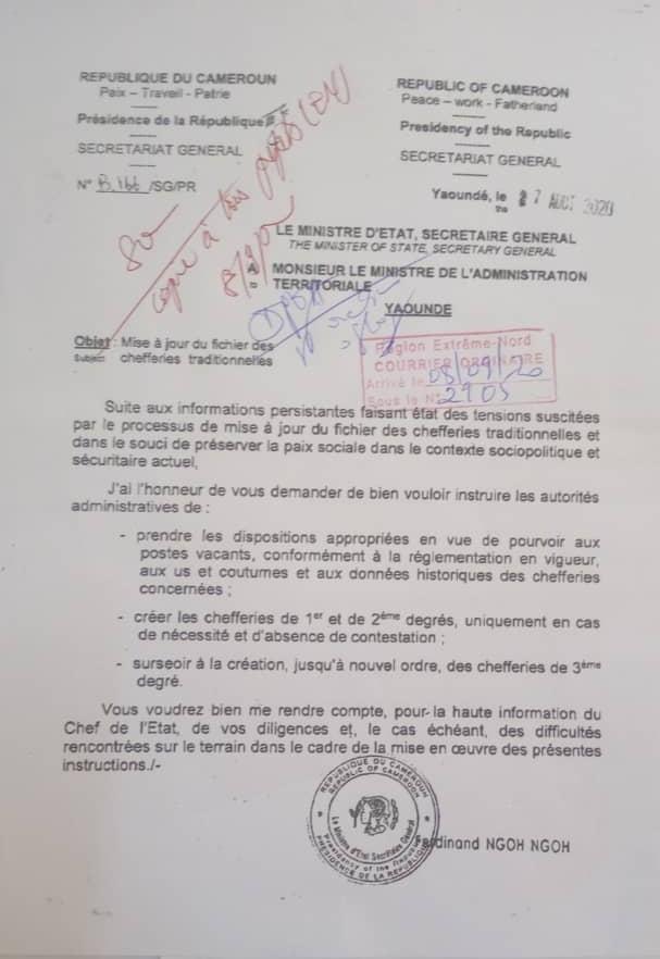 Également, il sera procédé à la création et à l’érection à différents degrés des chefferies « conformément aux dispositions légales en vigueur, aux us et coutumes ainsi qu’aux données historiques des chefferies concernées », indique la correspondance épistolaire de S.E Ferdinand NGOH NGOH.