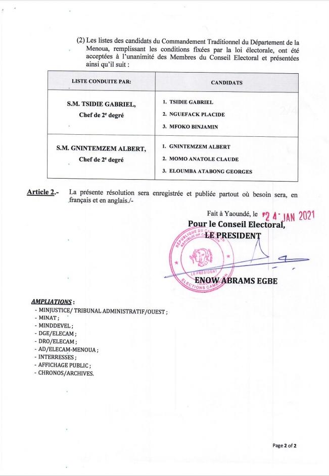 Les listes des candidats du commandement traditionnel du département de la Menoua, remplissant les conditions fixées par la loi électorale, ont été acceptées à l'unanimité des membres du conseil électoral et présentées ainsi qu'il suit: