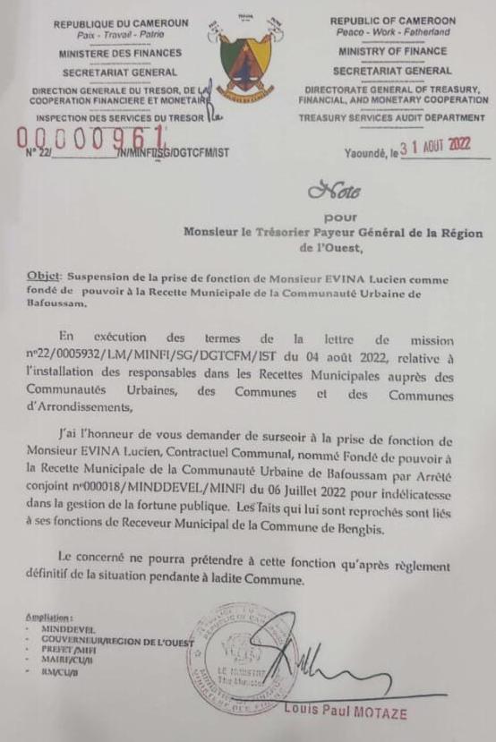 Nommé fondé de pouvoir à la recette municipale de la Communauté Urbaine de Bafoussam par un arrêté du 06 Juillet 2022, la prise de fonction de Lucien Evina vient d'être suspendue par le Trésorier Payeur Général de la région de l'Ouest.