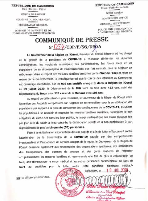 Dans ce communiqué le gouverneur de la région de l'ouest appel une fois de plus les populations au respect des mesures barrière prescrites par le gouvernement.