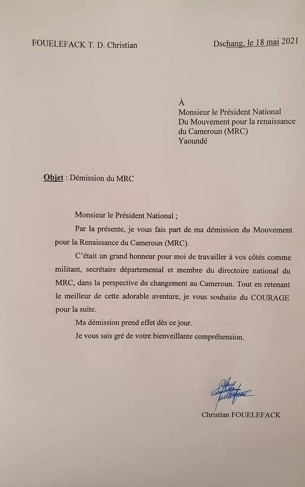C'est sur son compte Facebook, il y'a une trentaine de minutes que nous apprenons la démission de l'ancien secrétaire à la fédération départementale du mrc Menoua, par ailleurs membre du directoire national.