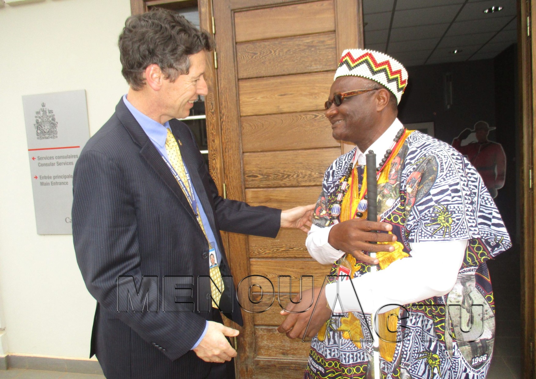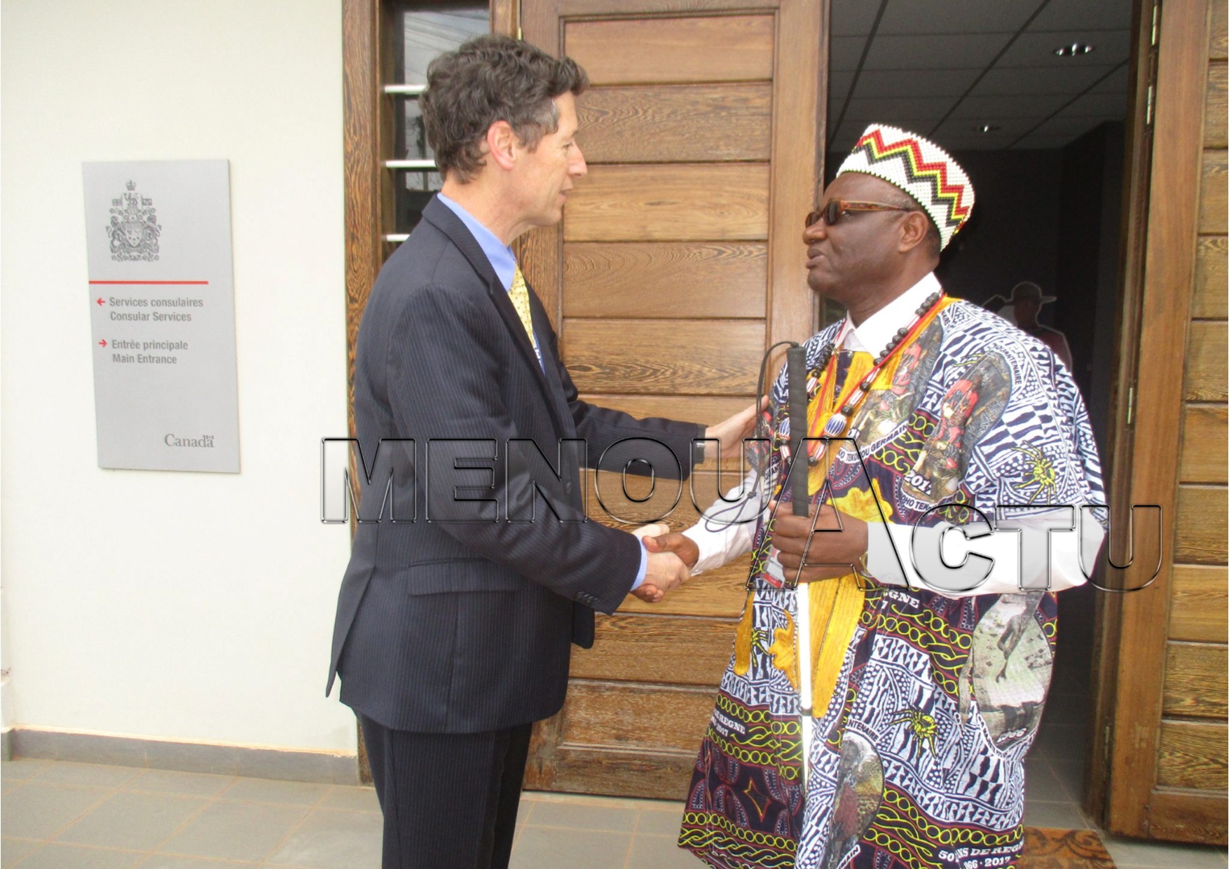 Sur le plan de la diplomatie, les relations entre le Canada et le Cameroun sont excellentes et Paul Tezanou, Président de l'Association Nationale des Aveugles du Cameroun(ANAC) et Directeur du Centre des Jeunes Aveugles de Dschang(CJAD) l'a compris et sait les mettre au profit de la communauté des personnes handicapées dont il est l'un des porte-paroles. L'amitié que le camerounais aveugle de naissance développe et entretient personnellement avec les différents chefs de la diplomatie canadienne au Cameroun se solidifie au fil des ans et la preuve inéluctable s'est re-matérialisée ce mardi 18 juillet 2017 au siège du haut commissariat du Canada à Yaoundé (Immeuble "Les Colonnades" Nouveau Bastos, 607 rue 1792). Le président de l'Union Francophone des Aveugles s'est en effet entretenu pendant près d'une heure de temps avec le diplomate canadien autour des questions qui touchent le handicap et l'aide canadienne au Cameroun.