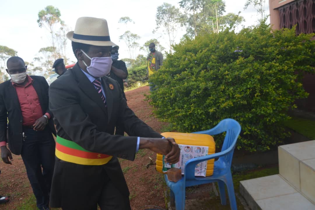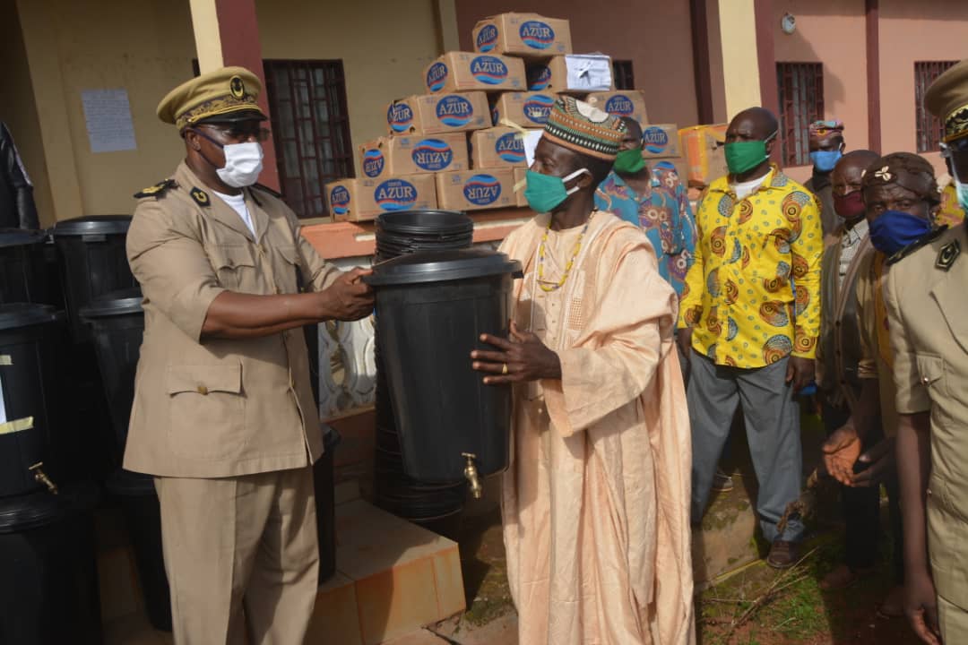 Du matériel constitué de 45 cartons de savons soit 3600 morceaux chacun, de deux cartons de gel hydro alcoolique de 12 bouteilles , de 25 seaux de de 30 litres avec robinet, de 150 seaux de 10 litres et d’un carton de 1000 cache-nez, telle est la part du gâteau national réservé à la commune que dirige le maire des sommets Dongue Paul dans l’optique d’améliorer la stratégie de riposte contre le coronavirus. Ce matériel constituera une bouffée d’oxygène pour environ 103 villages et quartiers de l’arrondissement de Fongo-Tongo qui n’entend pas perdre un de ses habitants du fait de cette maladie. Le préfet de la Menoua Godlive Mboke Ntua représentant le Chef de l’Etat en remettant ces dons à la population à réitérer le respect des mesures barrières.