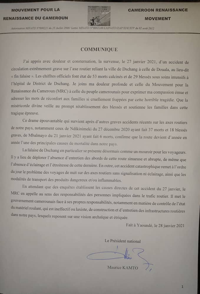 Dans un communiqué daté du 28 janvier 2021, Maurice Kamto fait le round up des drames survenus sur quelques axes routiers du pays, notamment Ndikiniméki, Dschang, et Mbalmayo. Avec le style qu'on lui connaît, le leader du MRC n'a pas manqué de toucher le mal à la racine en dépiautant les différentes défaillances conduisant aux multiples hécatombes sur nos axes routiers.