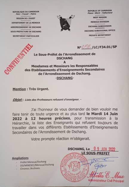 Ainsi, chaque responsable d'établissement a jusqu'au 14 Juin à 12heurs, pour faire parvenir à l'administrateur civil principal sa liste d'enseignants réfractaires.