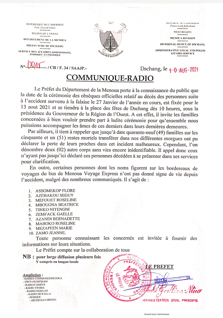 C'est finalement huit mois après le tragique accident survenu à la falaise de Dschang et le tout récent rite d'exorcisme des lieux par le chef supérieur du groupement Foréké-Dschang que les autorités administratives de la région ont décidé de l'organisation des obsèques officielles en l'honneur des disparus.
