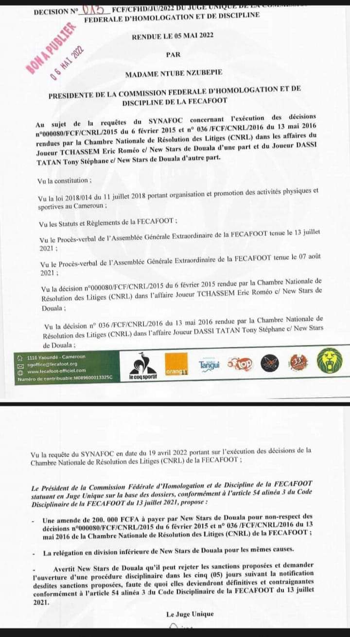 Cette décision de la commission fédérale d'homologation et de discipline de la Fecafoot du 6 Mai 2022, fait suite à la requête soumise par le SYNAFOC au sujet des plaintes portées à son endroit par deux joueurs de la dite équipe.