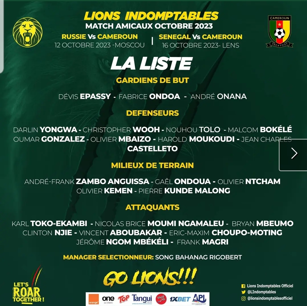Voici la liste des lions indomptables attendus à Moscou le 12 Octobre 2023 et à Paris le 16 du même mois pour les deux matchs amicaux des lions de cette période fifa.