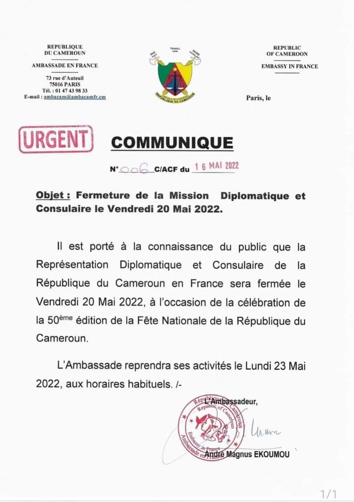 L' ambassade du Cameroun en France sera fermée du 20 au 23 Mai 2023. Si la raison officielle de cette fermeture est la célébration de la fête de l'unité, un autre motif peut être trouvé dans les possibles actions de la BAS au cours de la dite journée du 2