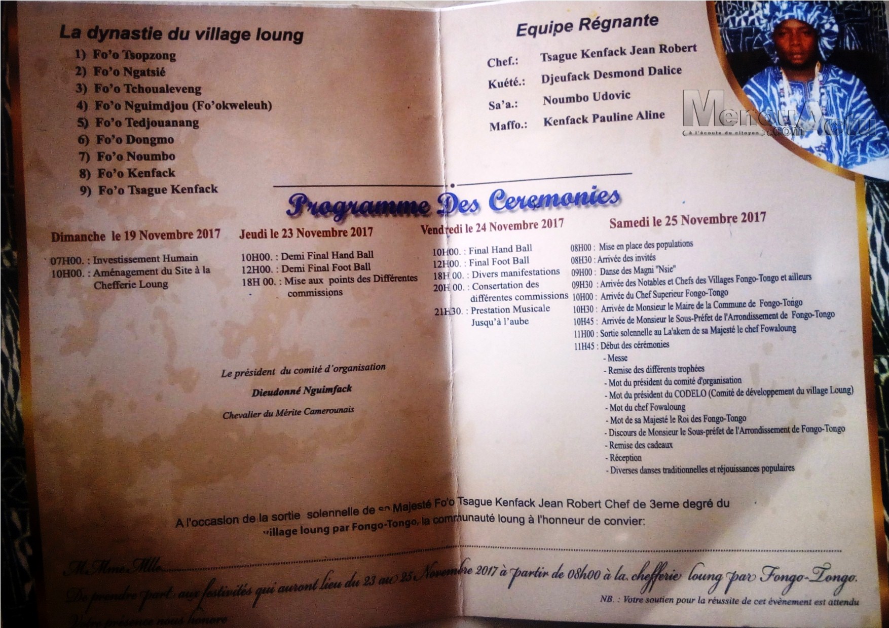 Les hostilités se dérouleront à l’esplanade de cette chefferie de 3eme degré, dans le groupement Fongo-Tongo du 23 au 25 novembre 2017 ; ce sera en présence de plusieurs autorités traditionnelles et administratives. Pour l’heure, c’est dans un esprit serein que les populations s’apprêtent pour réserver un accueil des plus chaleureux à leur nouveau chef. En prélude à grand jour, il sera organisé tour à tour des journées de propretés dans tout le village et particulièrement à la chefferie Loung ; des compétitions sportives et prestations artistiques.