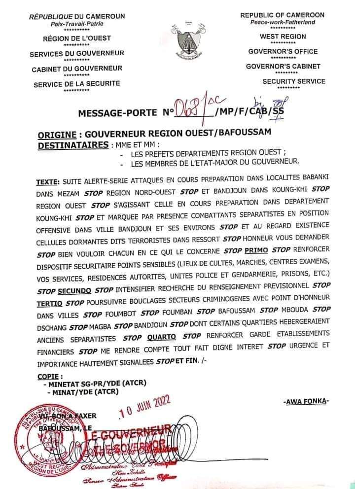 C'est au travers d'un message du Gouverneur de la région de l'Ouest aux sous préfets et préfets de la région, datant du 10 juin 2022 que l'annonce a été faite.