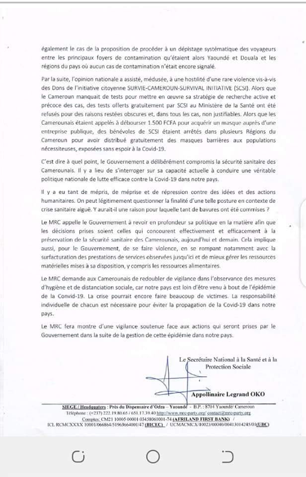 Le Mouvement pour la Renaissance du Cameroun demande au Camerounais de redoubler de vigilance dans l'observance des mesures d'hygiène et de distanciation sociale.