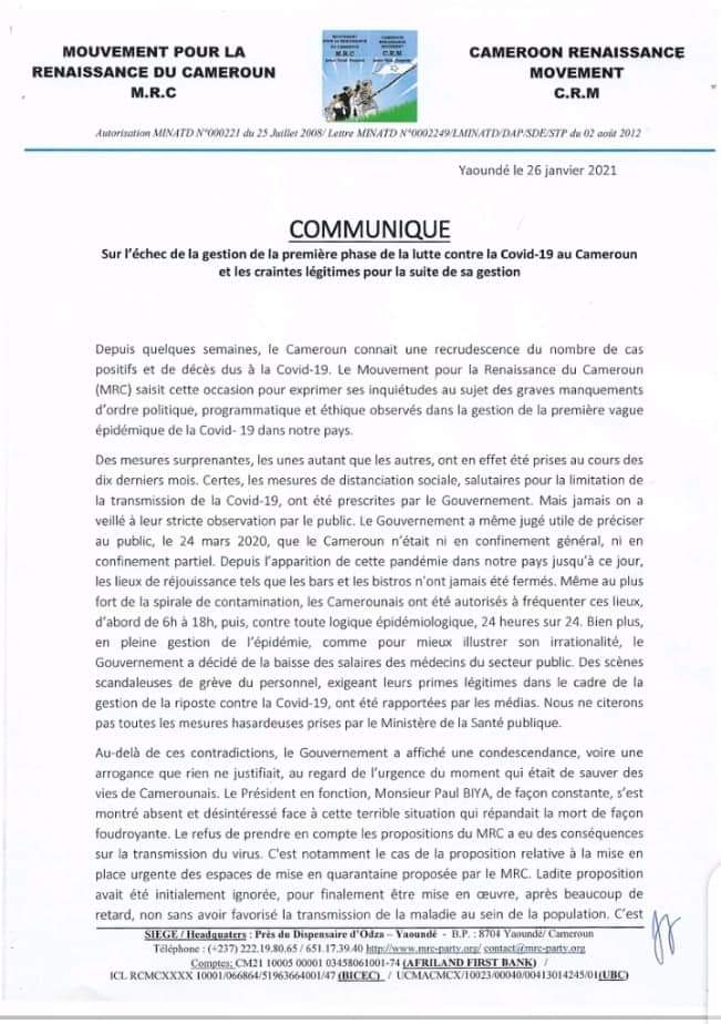 Le parti du Professeur Maurice Kamto précise dans sa sortie que le gouvernement a "délibérément compromis la sécurité sanitaire des camerounais" et l'invite à revoir sa politique en la matière.