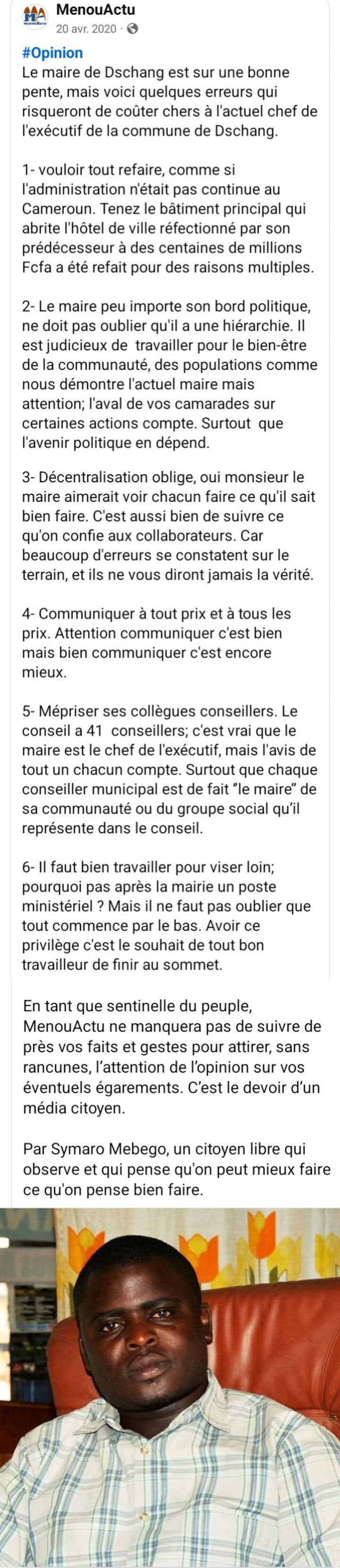 Il y a cinq ans, le directeur de publication du journal citoyen MenouActu, Symaro Mebego, avait mis en garde le Maire de Dschang, Jacquis Gabriel Kemleu Tchapgou, contre certaines erreurs qui pourraient coûter cher à la Commune.