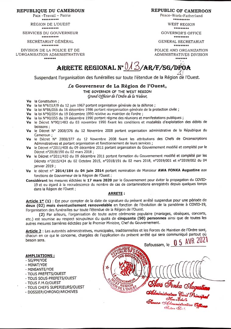 Cet arreté s à mon sens à besoin d'une circulaire interprétative. Notamment y ce qui concerne obsèques et funérailles : serait- on entrain de répondre par oui non a une interrogation totale? Si les funérailles prennent ici le sens bamiléké du terme.c'est- à-les cérémonies en l'honneur des morts et qui se pratiquent des années après la mort,on lit là une volonté manifeste de priver un peuple de sa culture pour deux mois éventuellement renouvelable. Combien de fois alors ? N fois ?