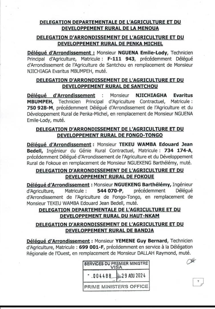 c'est en faveur de l'arrêté ministériel numéro 0000011 /Minader/Cab du 16 septembre 2024 portant nomination des responsables dans les services déconcentrés du Ministère de l'Agriculture et du Développement Rural que le ministre Gabriel Mbairobe mute l'ex