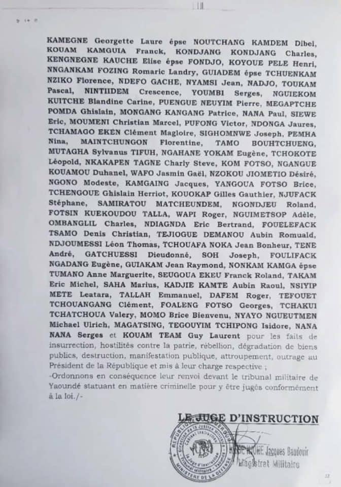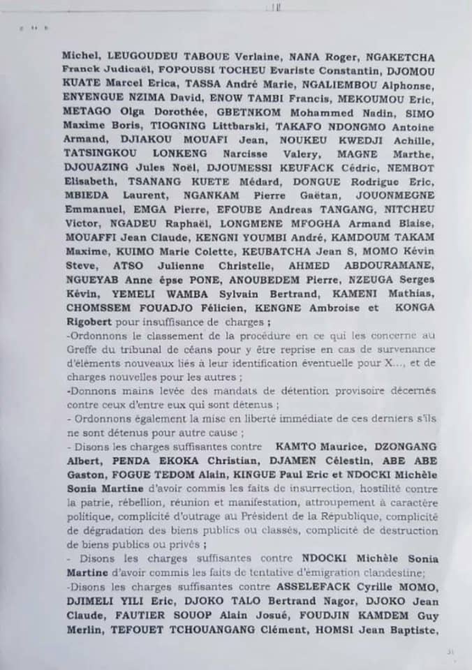 Toutefois, les leaders tels que Maurice Kamto, Christian Penda Ekoka, Albert Ndzongang Celestine Njamen, Michelle Ndoki et Eric Kingue continuent à purger leurs peines pour les motifs les plus rudes à eux collés. Entre autres chefs d’accusation : insurrection, rébellion, hostilité contre la patrie, dégradation des biens publics, attroupement…