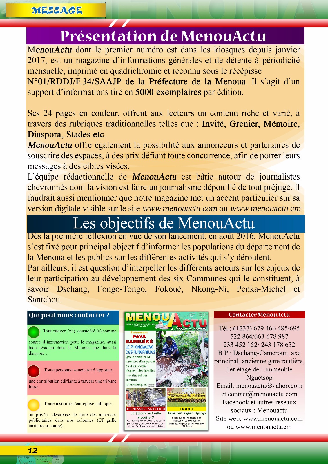 MenouActu votre journal d’informations et de détente en version Magazine, numérique et désormais via Menoua TV continue de faire ses preuves auprès de son public dont l’effectif se recrute de jour en jour. Votre fidélité à notre journal, votre apport et la confiance que vous nous avez réservée et continuez de nous réserver durant ce temps à contribuer à construire notre aura. Certes vrai, le progrès est considérable, mais il en faut encore plus. Pour cela la campagne de promotion pour les abonnements que lance MenouActu est un moyen de parvenir à nos objectifs. Les prix vont de 12000 FCFA à 120000FCFA et plus pour une année. Pour cela vous avez droit à un exemplaire à chaque parution du Magazine mensuel MenouActu pendant un an à compter de la date de votre souscription. Ce partenariat vous donne également des possibilités de communiquer sur vos projets dans nos colonnes et bien plus encore. Une synergie d’action pour un développement encore plus participatif. A rappeler que sont déjà disponibles dans nos locaux situés à l’ancienne gare routière de Dschang, (immeuble Express Union en face de CHOCONOU,) les gadgets MenouActu pour vous, nos fans. Téléphone 679 466 485/ 695 522 864
