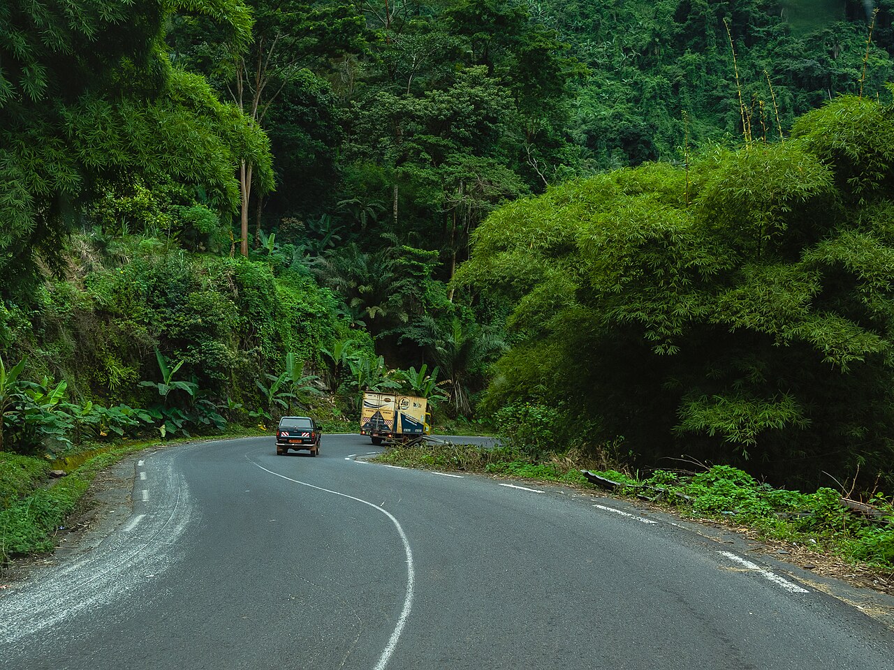 On observe des piétons sur les accotements, trop près des véhicules roulants, des véhicules lourds et légers à l'arrêt ou effectuant des dépassements dangereux, des véhicules en mauvais états, dégageant des fumée d'échappement et par endroits des trous sur la chaussée