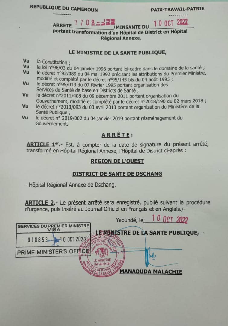 L'arrêté a été signé le 10 Octobre dernier par le Ministre de la Santé Publique Manaouda Malachie. Ainsi, l'ancien Hôpital de District de Dschang, après plusieurs années d'existence et de services rendus, ferme la porte pour laisser place à l'Hôpital