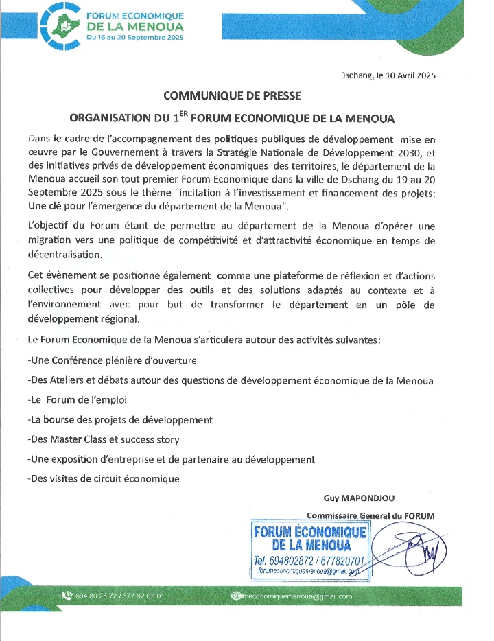 Le 1er forum économique de la Menoua sera une plateforme de discussion et de réflexion sur l'avenir économique du département. Sous le thème "Incitation à l'investissement et financement des projets : une clé pour l'émergence du département de la Menoua", cet événement vise à transformer le département en un pôle de développement régional.