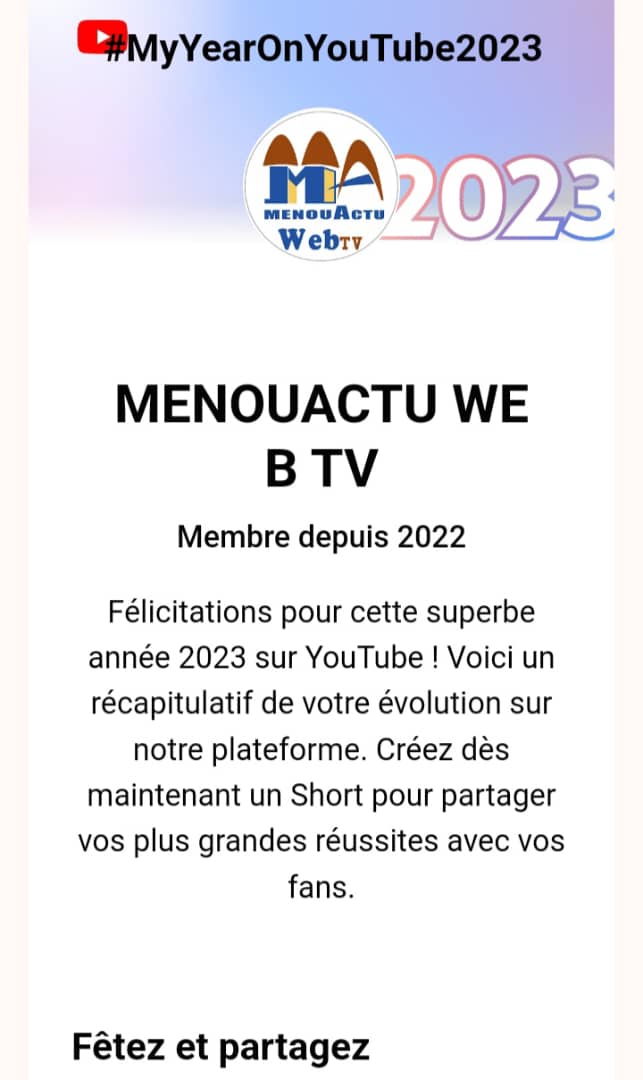 <<Félicitations pour cette superbe année 2023 sur YouTube >>. C'est entre autres une partie du message délivré par YouTube pour ce travail titanesque. Si l'objectif est loin d'être atteint, MenouActuwebtv devra mettre les bouchées doubles pour s'imposer par son travail et continuer de mériter la confiance de ses milliers de followers.