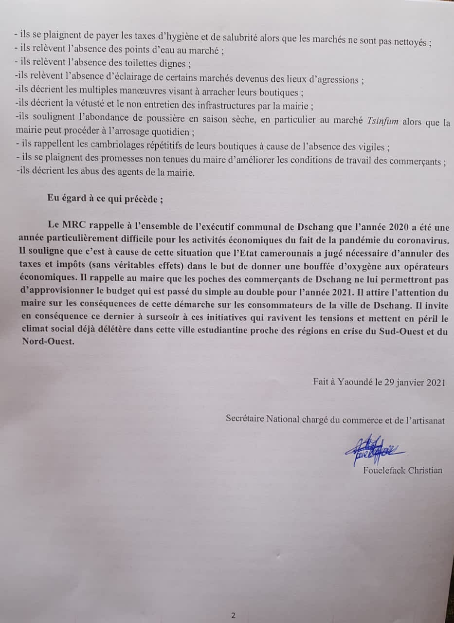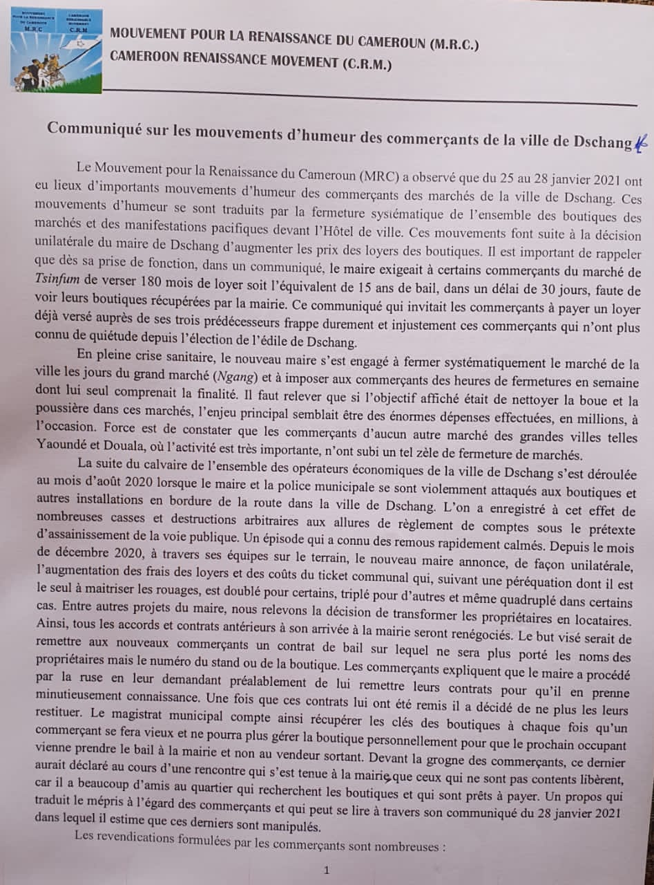 Ce communiqué fait suite à un mouvement d'humeur des commerçants de la ville de Dschang qui dénoncent des pratiques peu orthodoxes du Maire de la ville. Si le secrétaire national en charge du commerce et l'artisanat du MRC s'insurge contre des pratiques susceptibles d'embraser le climat social délétère dans la Menoua, il fustige tout aussi le modus operandi du Maire qui s'est joué de la vigilance des commerçants.