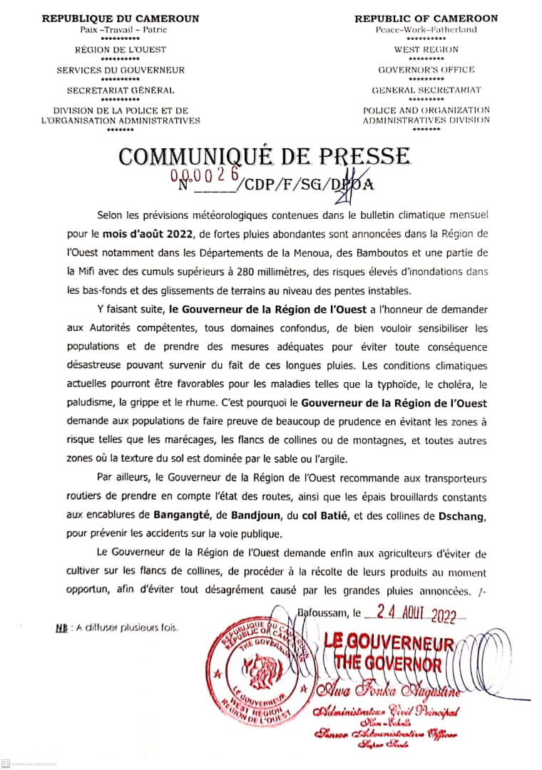 D'après le communiqué du 24 Août 2022 signé du gouverneur de la région de l'Ouest, la région du soleil couchant connaîtra des moments trouble à partir de cette fin du mois, en raison des conditions climatiques difficiles.
