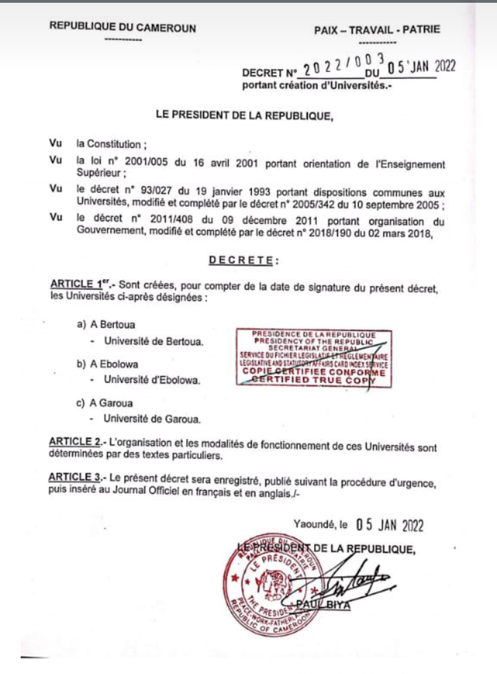 Après avoir annoncé dans son adresse à la nation du 31 Décembre 2021 qu'il dotera trois régions du Cameroun d'universités, le Président de la République a signé le décret d'ouverture ce 5 Janvier 2022.