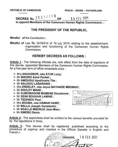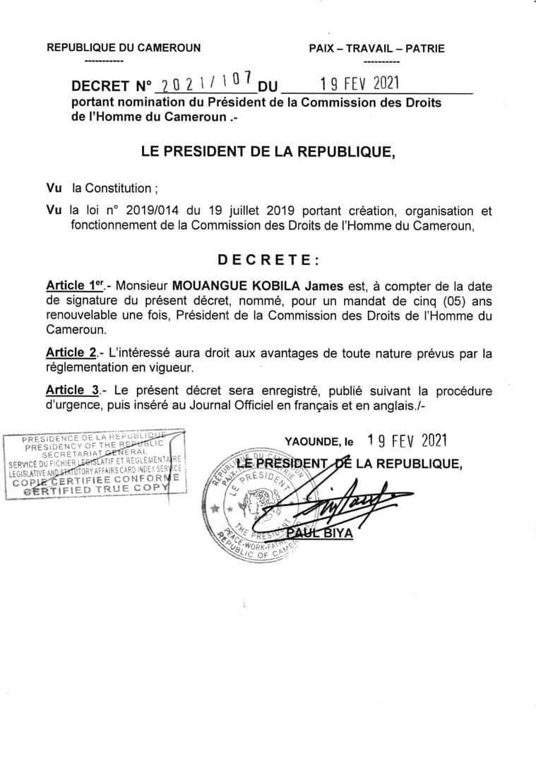 Le décret N°2021/110 du 19 février 2021 signé des mains de maître par Paul Biya nomme plusieurs personnes à la commission nationale des droits de l'homme.