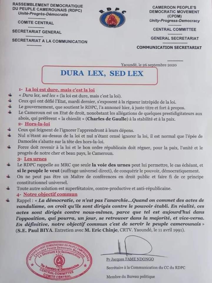 Le Secrétaire à la Communication du Comité central du Rassemblement démocratique du peuple camerounais le Pr Jacques Fame Ndongo rappelle que la loi est dure mais, c’est la loi.