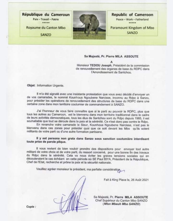 Dans cette lettre signée le 26 du mois courant depuis King place alors que le chef en exil, il ne cache pas ses émotions et attire l'attention de sieur Tedou Joseph président de la commission de renouvellement des organes de base dans l'arrondissement de Santchou sur le risque de trouble à la paix sociale s'il venait à conserver le chef Narcisse Kounhoua surtout continuer à lui permettre d'effectuer les descentes dans son territoire alors qu'il serait sur les verrous d'une sanction traditionnelle.