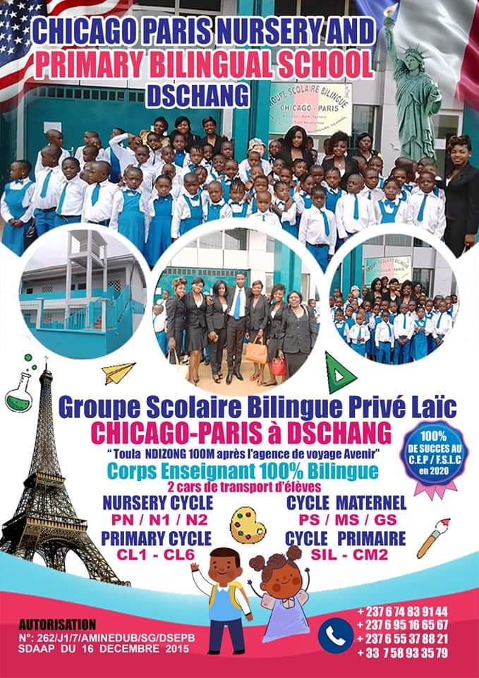 Le Groupe Scolaire Bilingue Privé Laïc Chicago-Paris situé à Toula Ndizong dans le Groupement Foto est tenu des mains de maitre par son Directeur ZAMKEU Epolic fonctionne sous autorisation N°262/J1/7/MINEDUB/SG/DSEPB SDZZP DU 16 Décembre 2015. Les inscriptions sont ouvertes au sein de l’établissement tous les jours ouvrables.