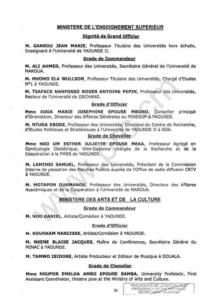 D'autres grands noms de la région de l'Ouest ont également retenu l'attention du Président de la République. C'est le cas du professeur titulaire hors échelle Jean Marie Gankou, élevé au grade de Grand Officier, de l'artiste comédien Kouokam Narcisse et du célèbre artiste musicien Tamwo Isidore, tous deux promus Officier de l'ordre de la valeur.